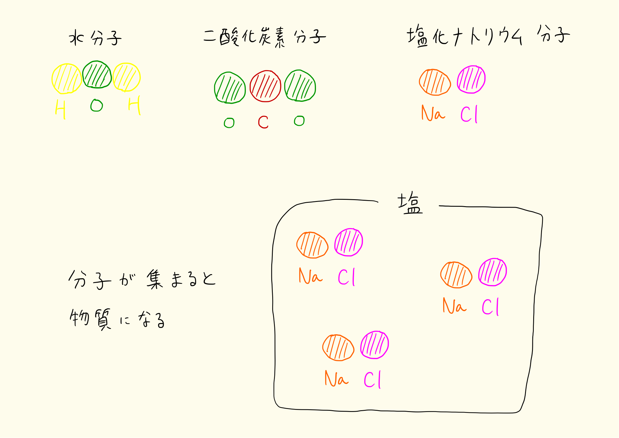 塩化ナトリウム分子は、1個の塩素原子と1個のナトリウム原子がくっついた分子。一方、二酸化炭素は1個の炭素原子と2個の酸素原子がくっついた分子。