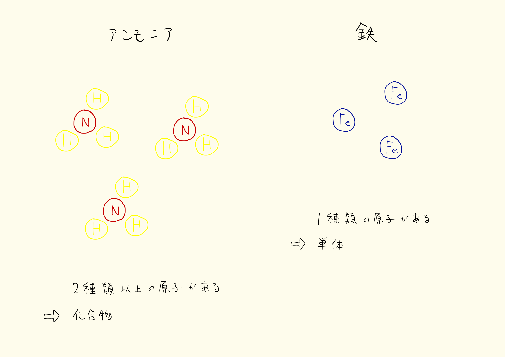 物質を構成する原子が一種類のものを単体、二種類以上のものを化合物という。例えば鉄はどこまで細かくしても鉄でしかなく、最小単位は鉄原子である。したがって鉄は単体となる。