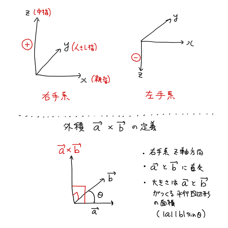 ベクトルの外積を考えるときは右手系の座標を使う。