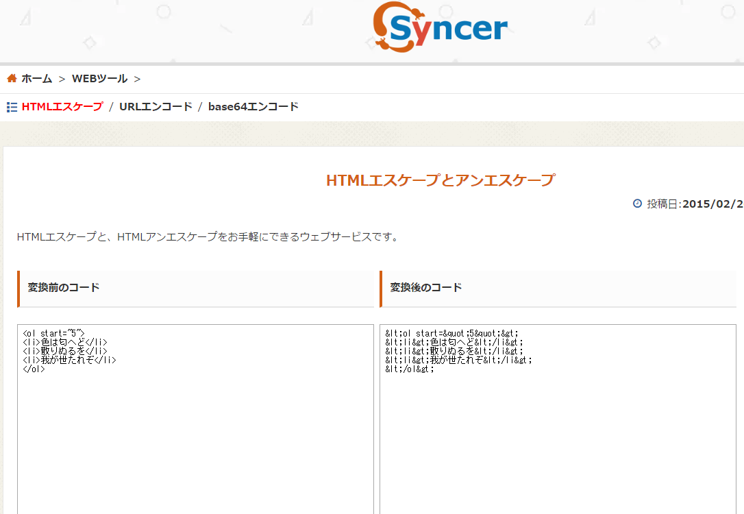 ※「HTMLエスケープとアンエスケープ(SYNCER)」のスクリーンショットより。