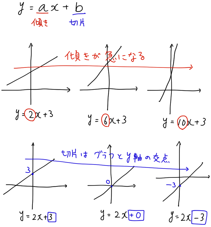 一次関数 の を傾き、 を切片という。 はグラフの傾き、 はグラフと 軸の交点を意味します。
