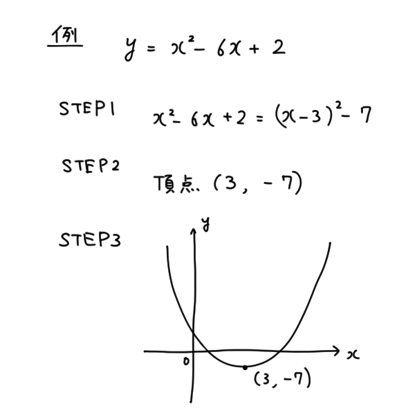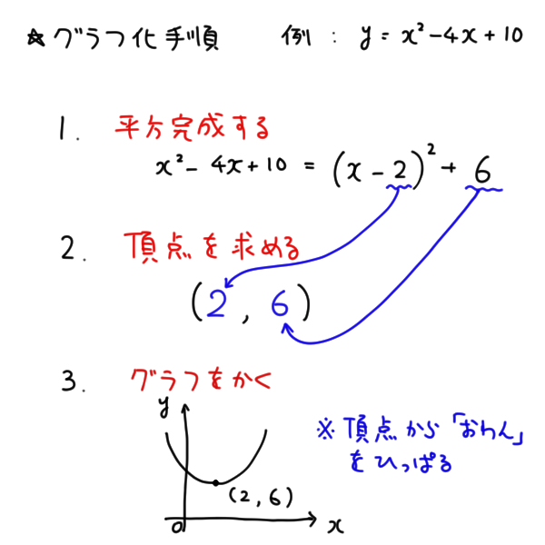 グラフは平方完成、頂点の決定、グラフ化の三ステップで描きます。平方完成して出てきたカッコの中の数字と、カッコの外の数字が、頂点のX、Y座標になります。先ほど説明したように頂点さえわかれば、山またはおわんを描くことでグラフが完成します。