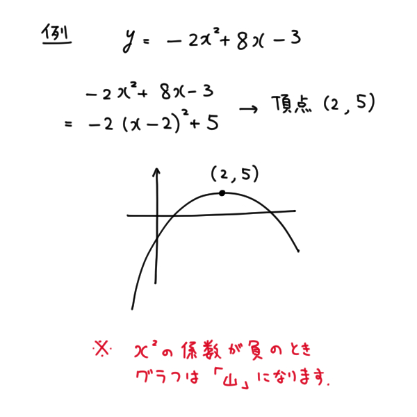 二次関数のグラフは中学生の時に習ったように山かおわんで、形はつまるところ二パターンしかありません。あとは山またはおわんのてっぺん(または底)の位置さえわかれば、グラフが完全にかけます。この山のてっぺん、またはおわんの底を頂点といいます。