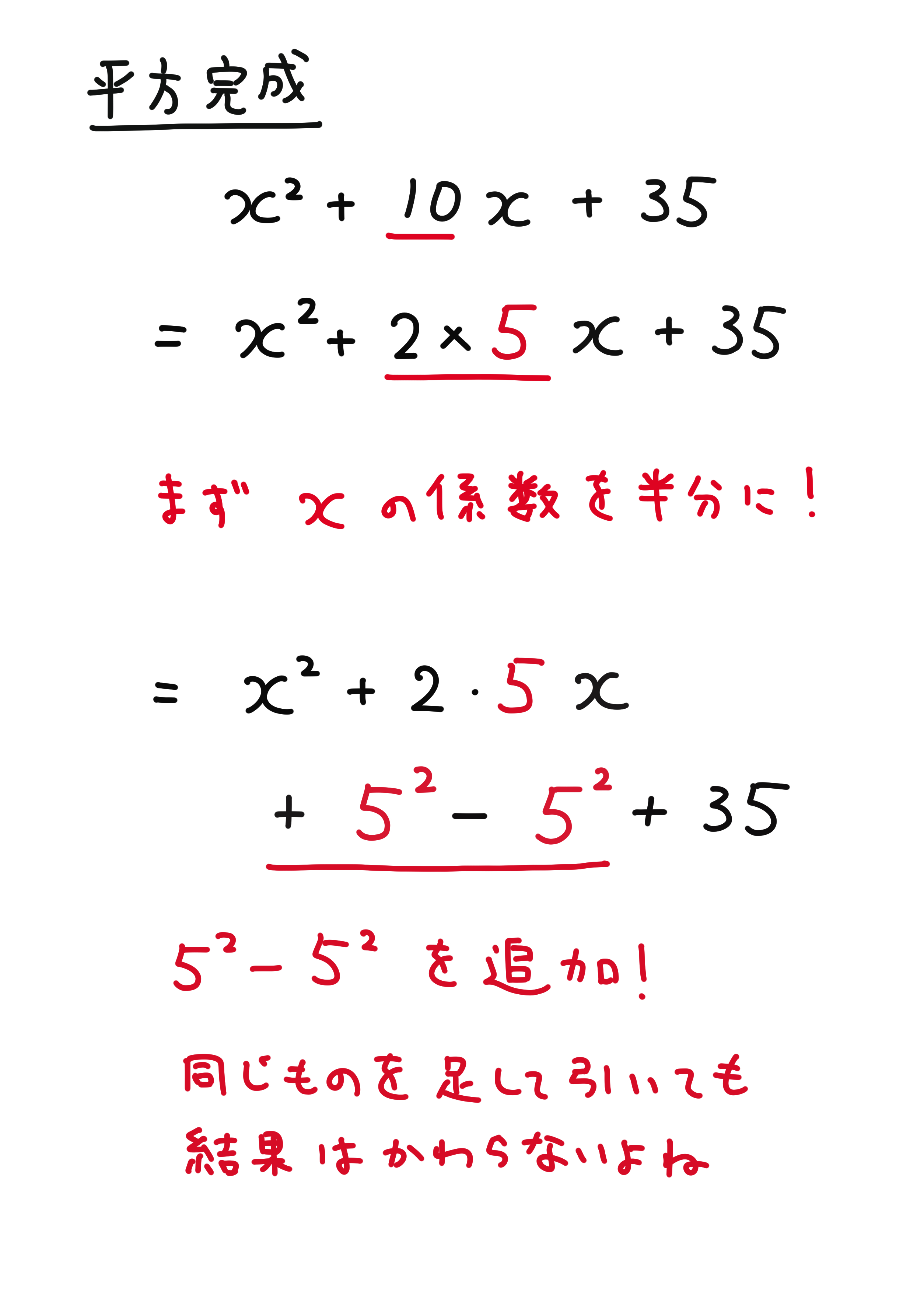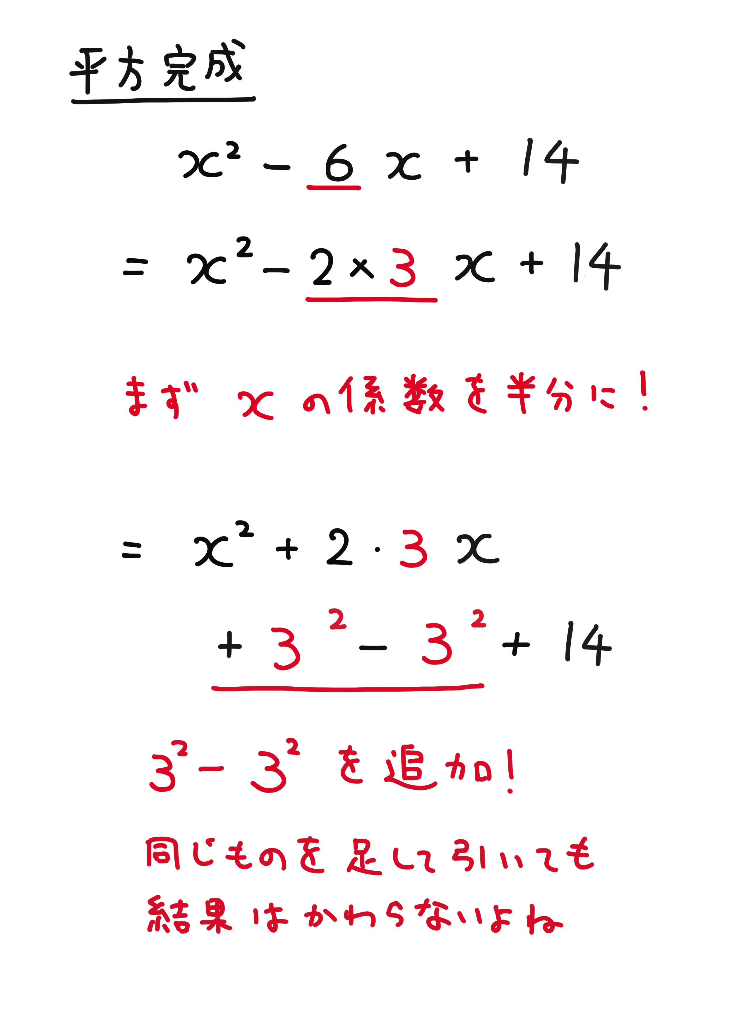 計算が少し複雑になっただけで、やり方はまったく変わりません。 二次係数(二乗の係数)が1の問題を解けるようにしましょう。ポイントは真ん中の係数を半分にすること。半分にした数を二乗した数を足して引くというクッションを置くことで、その後の因数分解がスムーズに進みます。