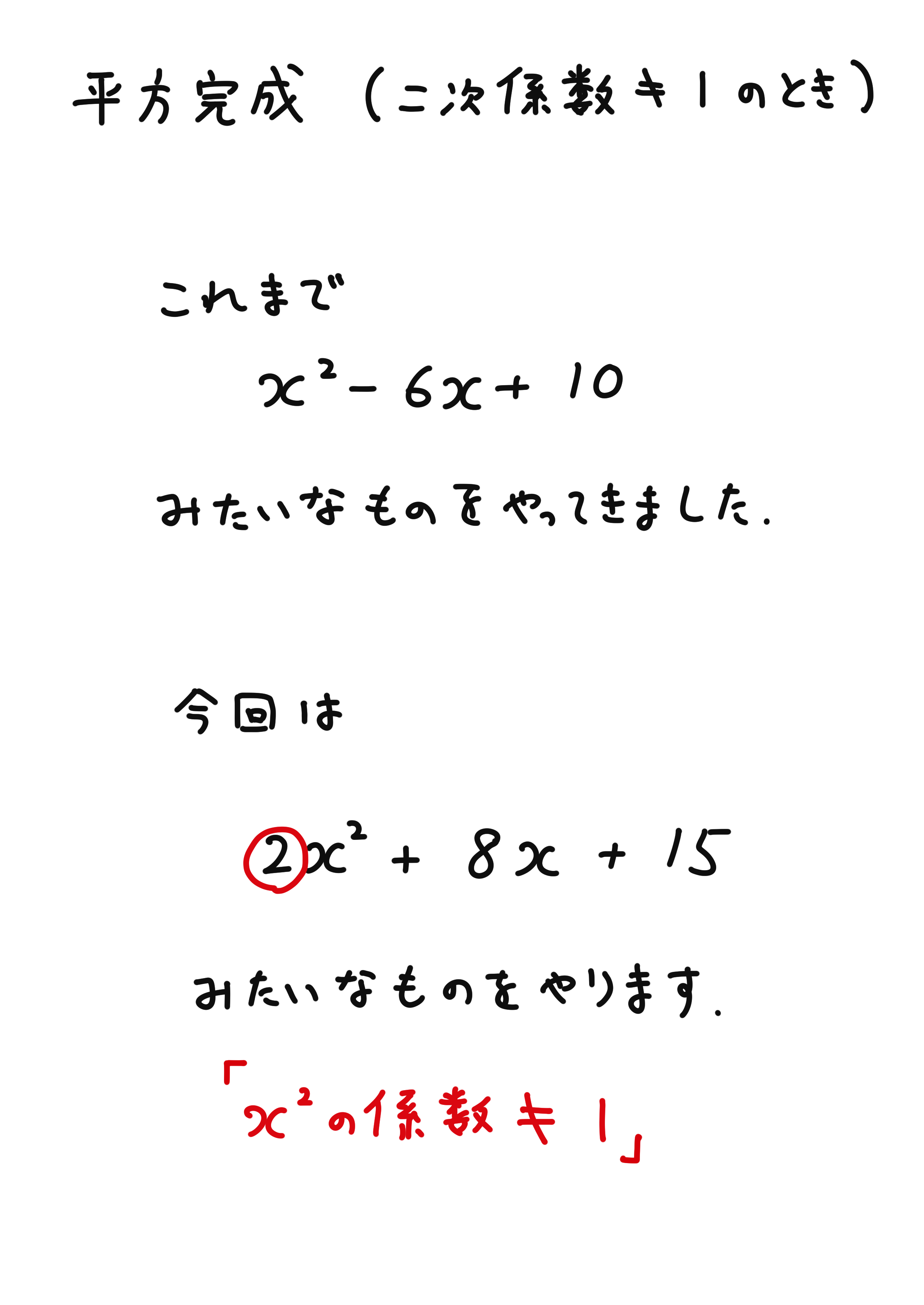 平方関数はいろいろパターンがありますが、まずは二次の係数が1の問題を解けるようにしましょう。