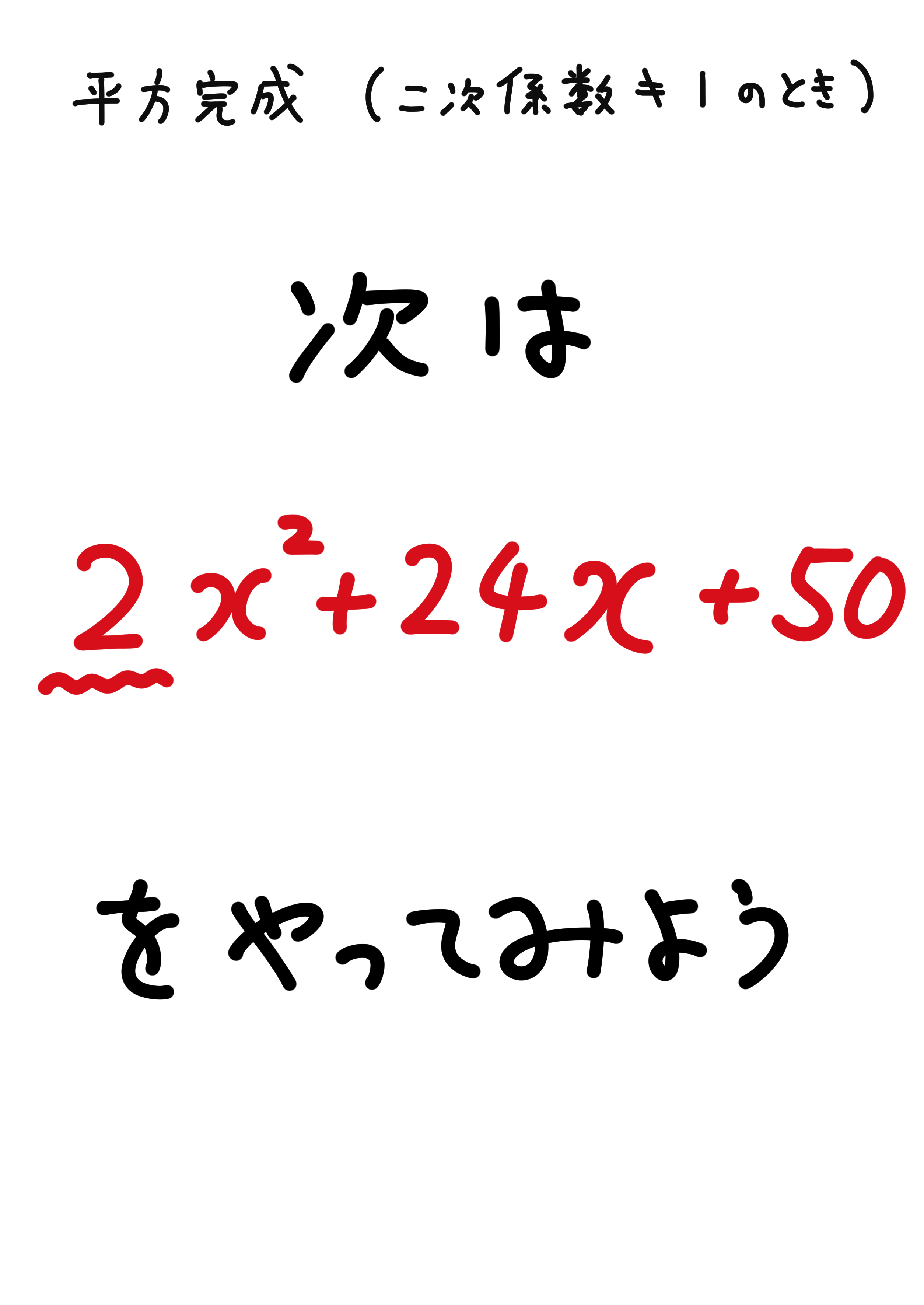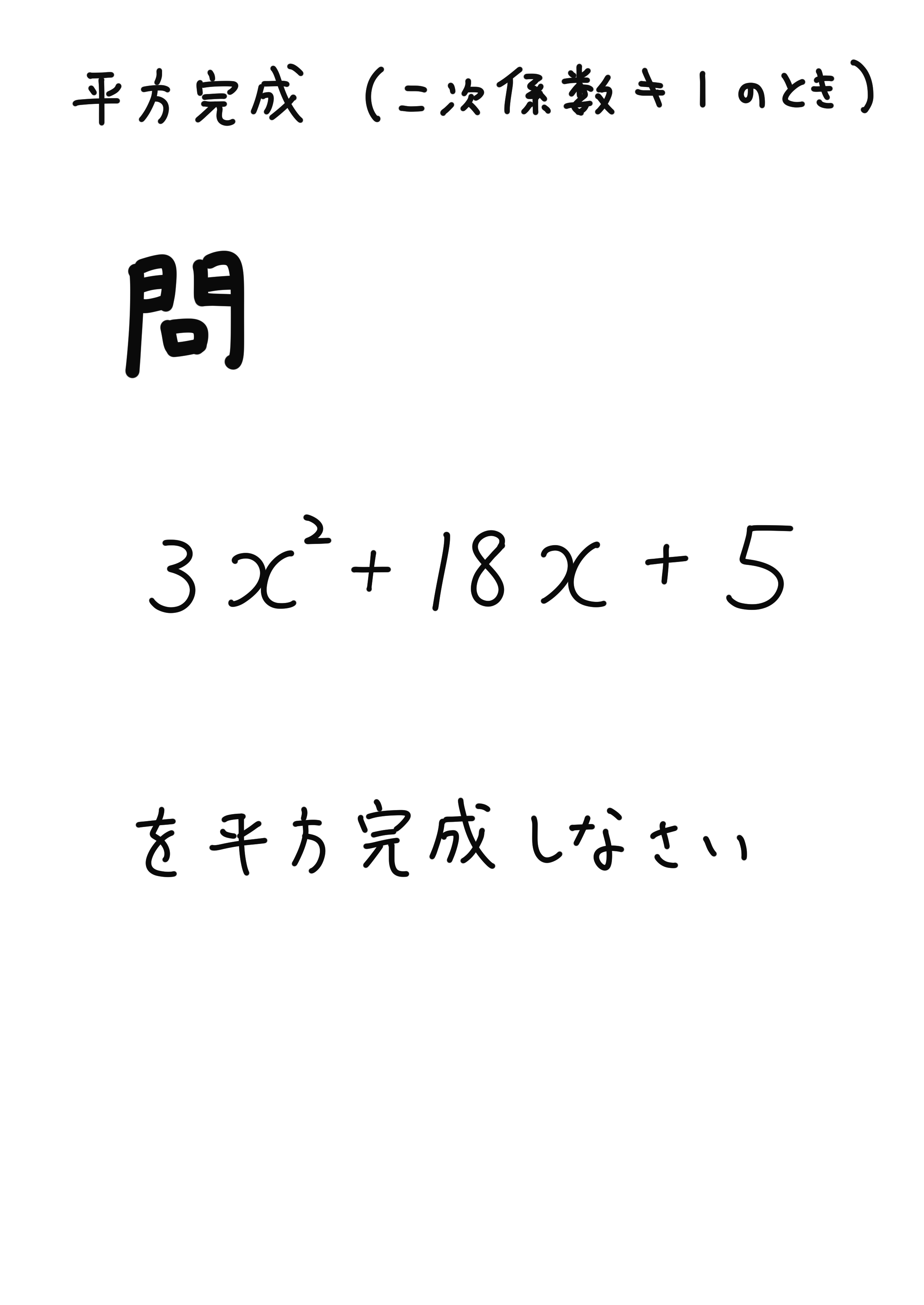 ちょっと途中経過を省いてみました。上のプリントが「わかる!」となったらもう大丈夫です。今まで意図的に一次係数を偶数にしてきましたが、今回は奇数です。