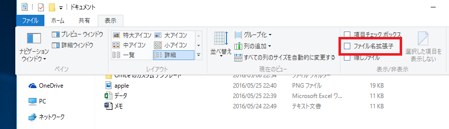 赤い枠で囲まれた「ファイル名拡張子」にチェックすると