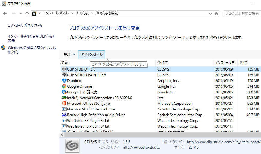 上の画面になったらアンインストールしたいプログラムを左クリックする。すると上のバーに「アンインストール」というボタンが出てくる。それまでのWindowsに慣れている方にとってなじみ深い方法である。