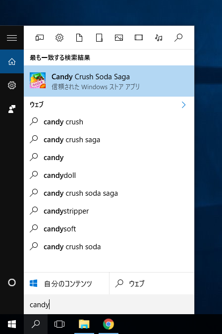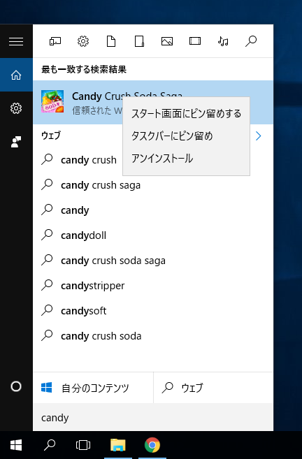 個人的に一番使いやすい方法が検索画面からのアンインストール。タスクバーの検索ボックスにアンインストールしたいプログラム名を入れる(または検索アイコンを一度クリックして検索ボックスにアンインストールしたいプログラム名を入れる)。
