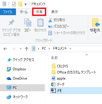 下図の「メモ」というファイルを圧縮したいとする。そのためにまずファイルエクスプローラーのメニューから「共有」をクリック。