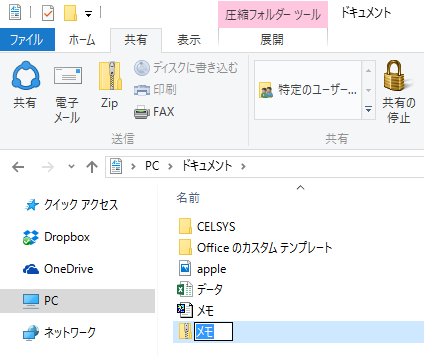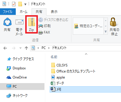 すると下のように「zip」というボタンが出てくる。「共有」→「zip」はWindowsをいろいろと触っていないとなかなか見つからない。