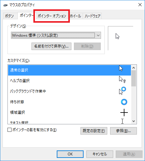 上のメニュータブの[ポインターオプション]を選ぶ。