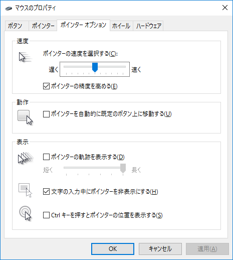 Windows10ではマウスポインター(カーソル)の速度を遅くしたり速くしたりできる。またマウスの動きに合わせてマウスポインターの軌跡を表示することもできる。
