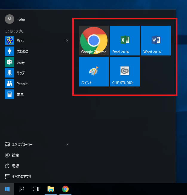 Windows10のスタート画面とは下図の赤枠で囲っている部分である。
