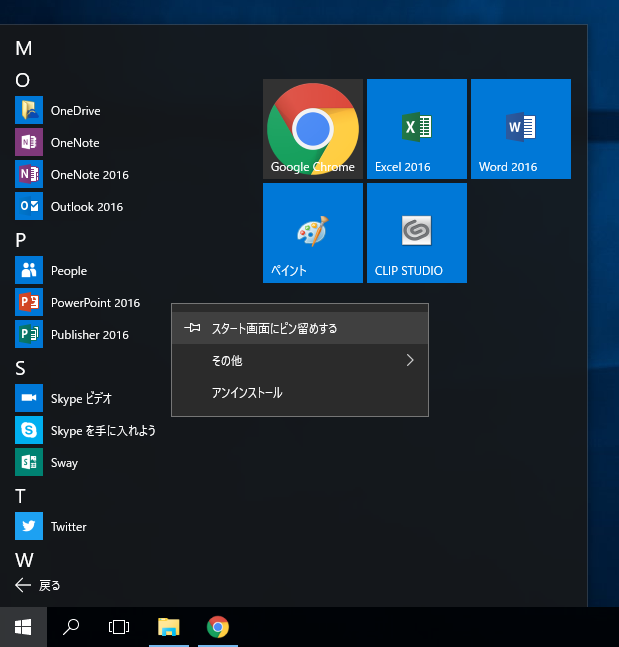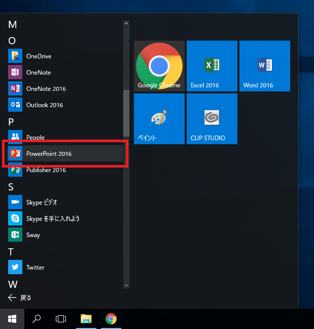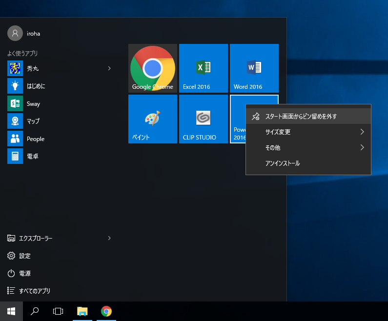 ここではMicrosoft PowerPointをスタート画面にピン留めする。