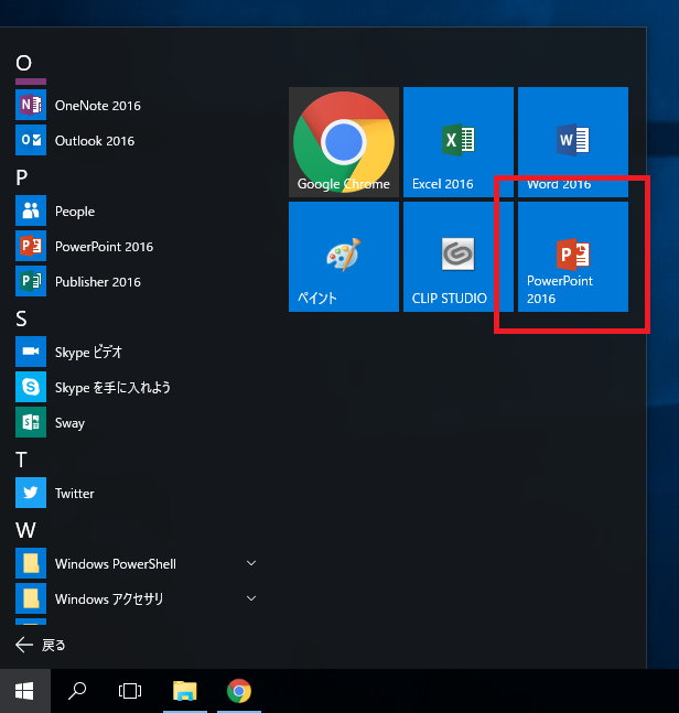 Microsoft PowerPointがスタート画面に登録された。MicrosoftのOffice関連はまとめてピン留めするといいかもしれない。
