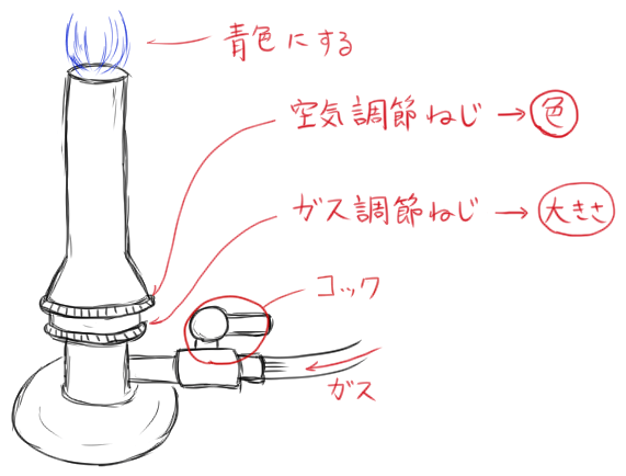 の順で、ガスの炎の色は青色になるようにする。