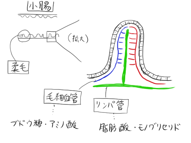分解されたブドウ糖とアミノ酸は毛細血管、脂肪酸とモノグリセリドはリンパ管を通って他の器官に移動する。