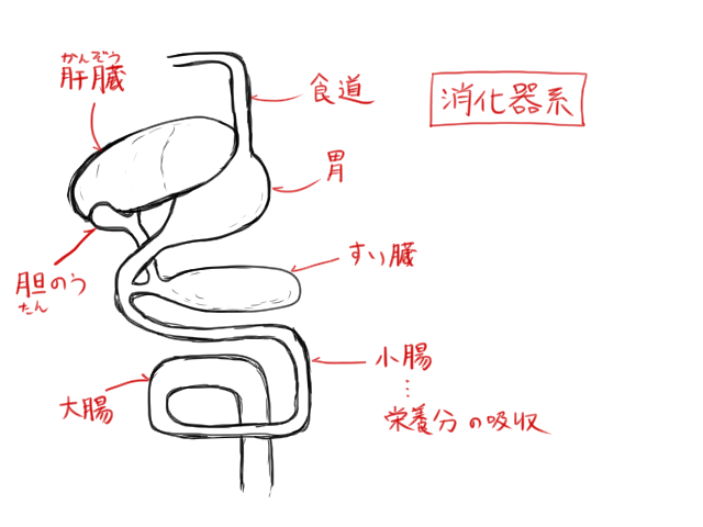 | 消化器 | 口、食道、胃 肝臓、胆のう、すい臓 小腸、大腸、肛門 |