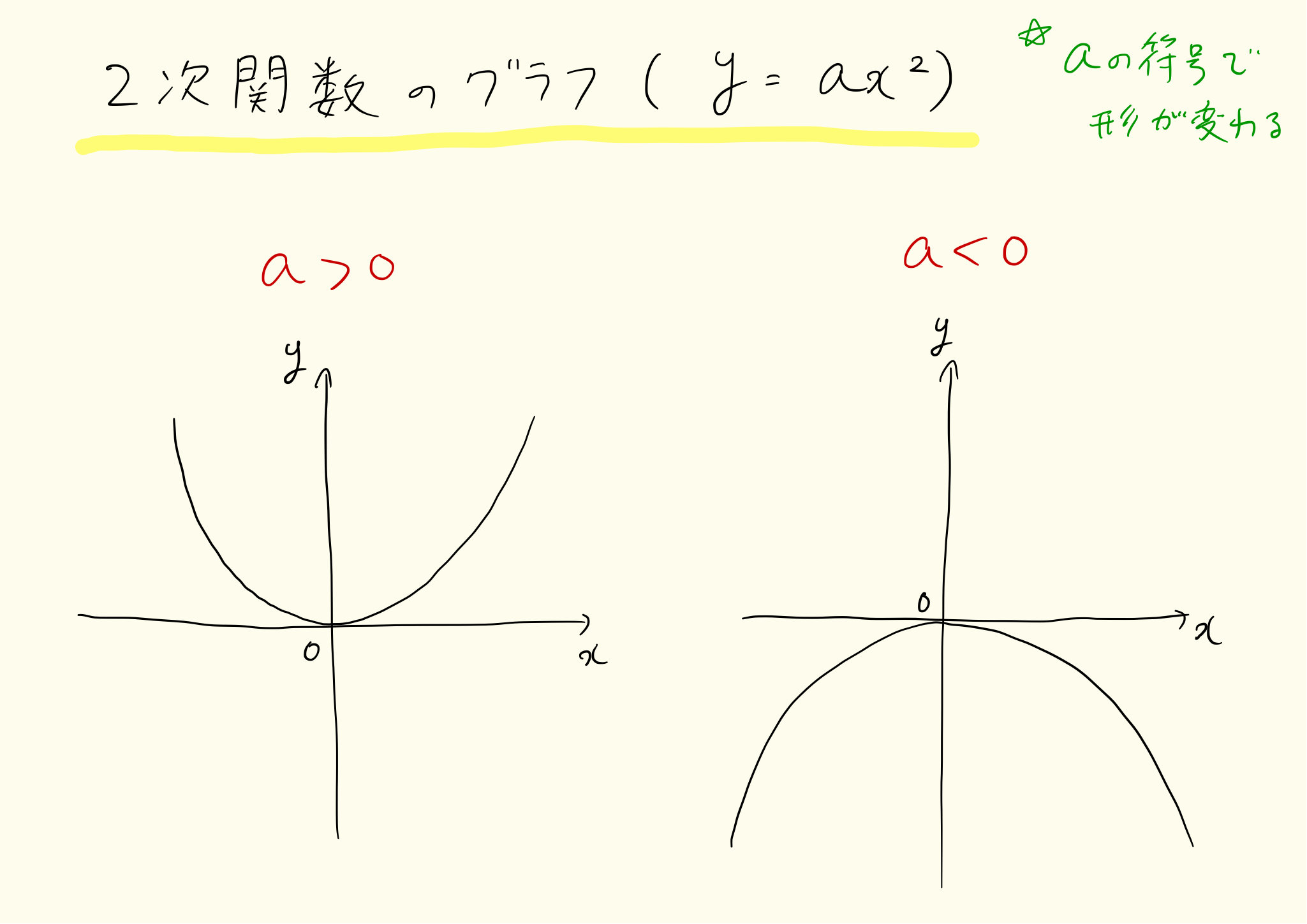 二次関数y=ax^2のグラフは下図のようにおわん型をとります。aが0より大きいとき、グラフは谷をつくります。aが0より小さいとき、グラフは山をつくります。