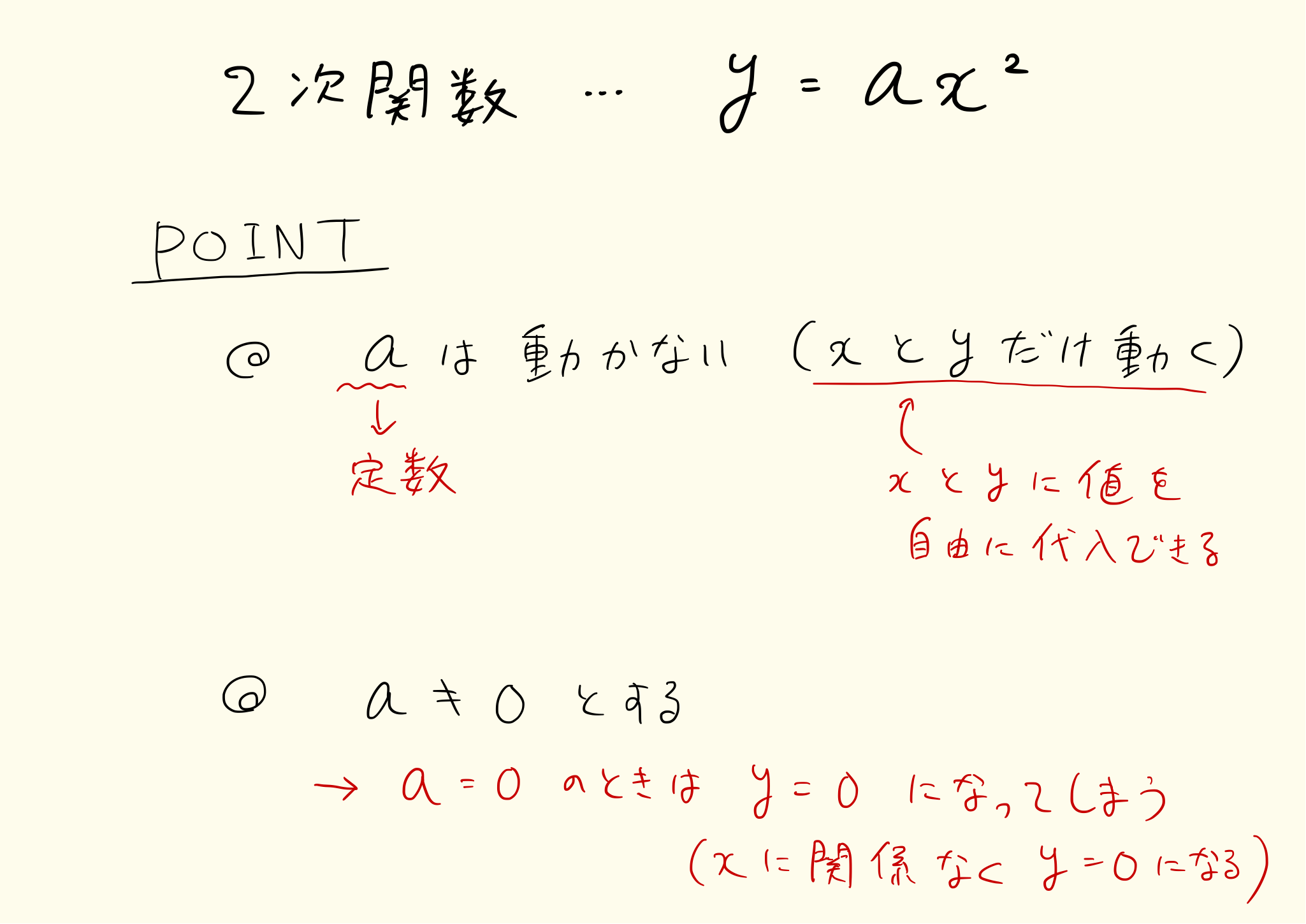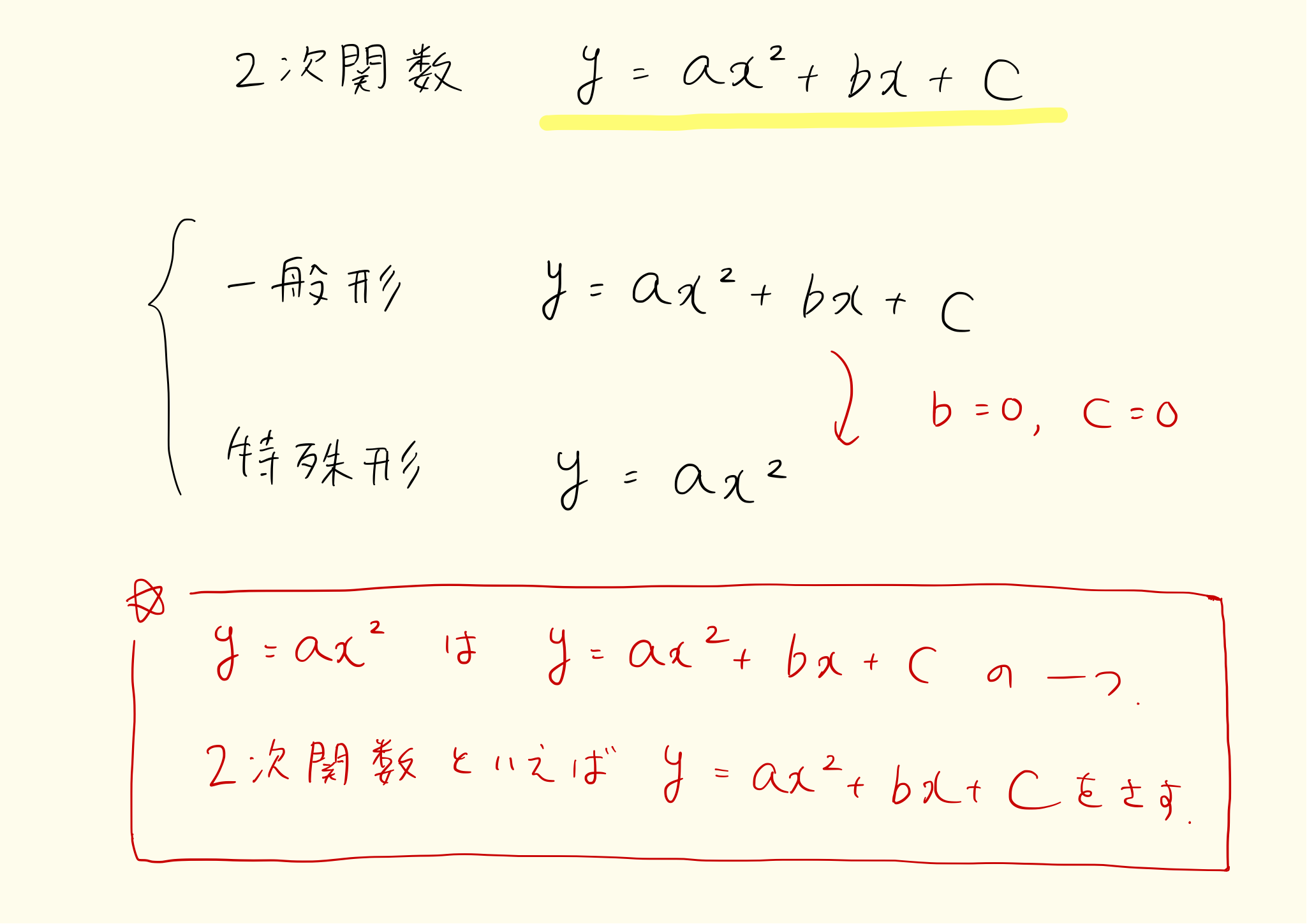 二次関数はy=ax^2+bx+cで表される関数です。これまで扱ったy=ax^2は、y=ax^2+bx+cのbとcを0にした特殊な形です。