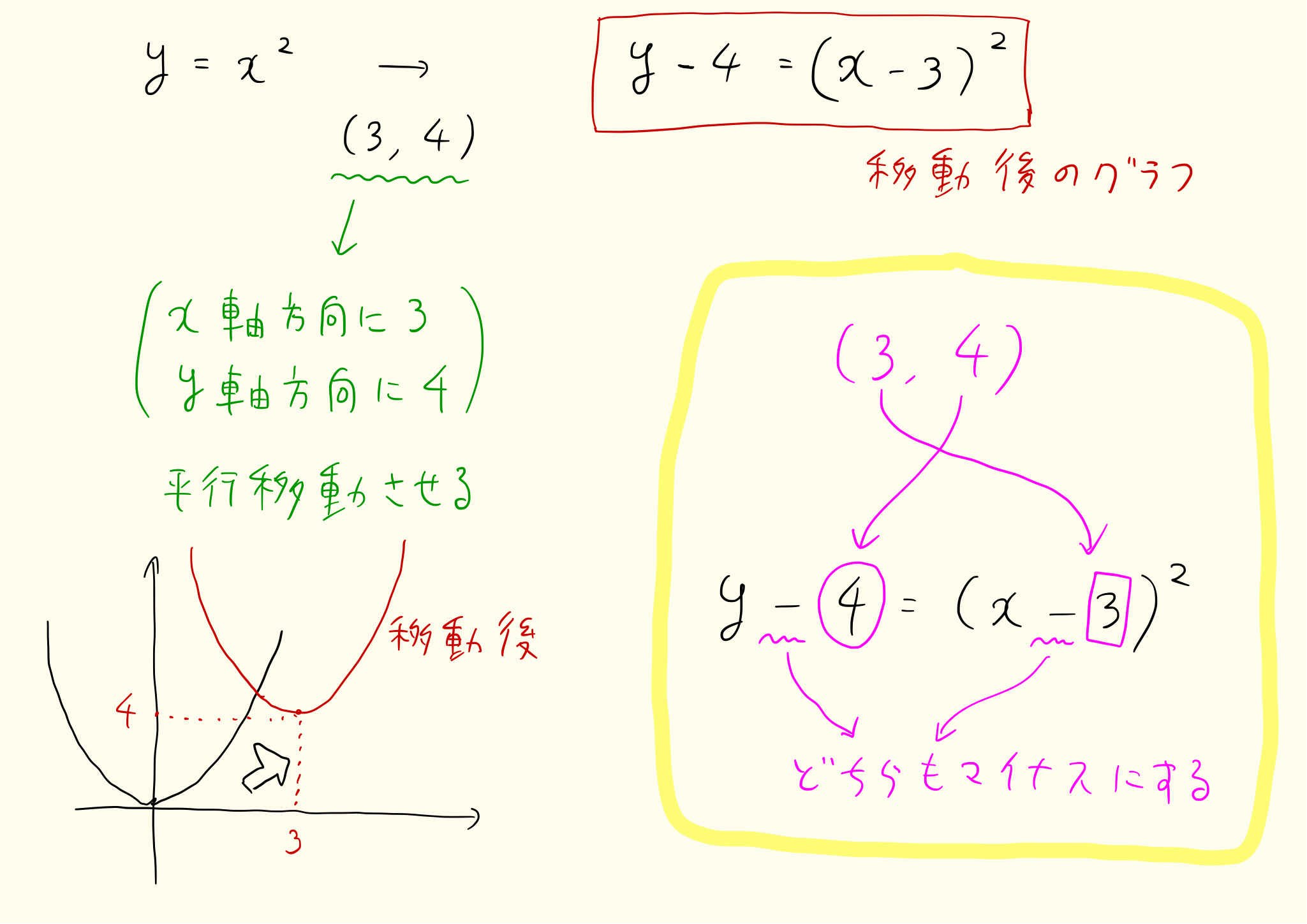 y=x^2は、x軸方向にp、y軸方向にqだけ平行移動させた関数はy-q=(x-p)^{2}となります。