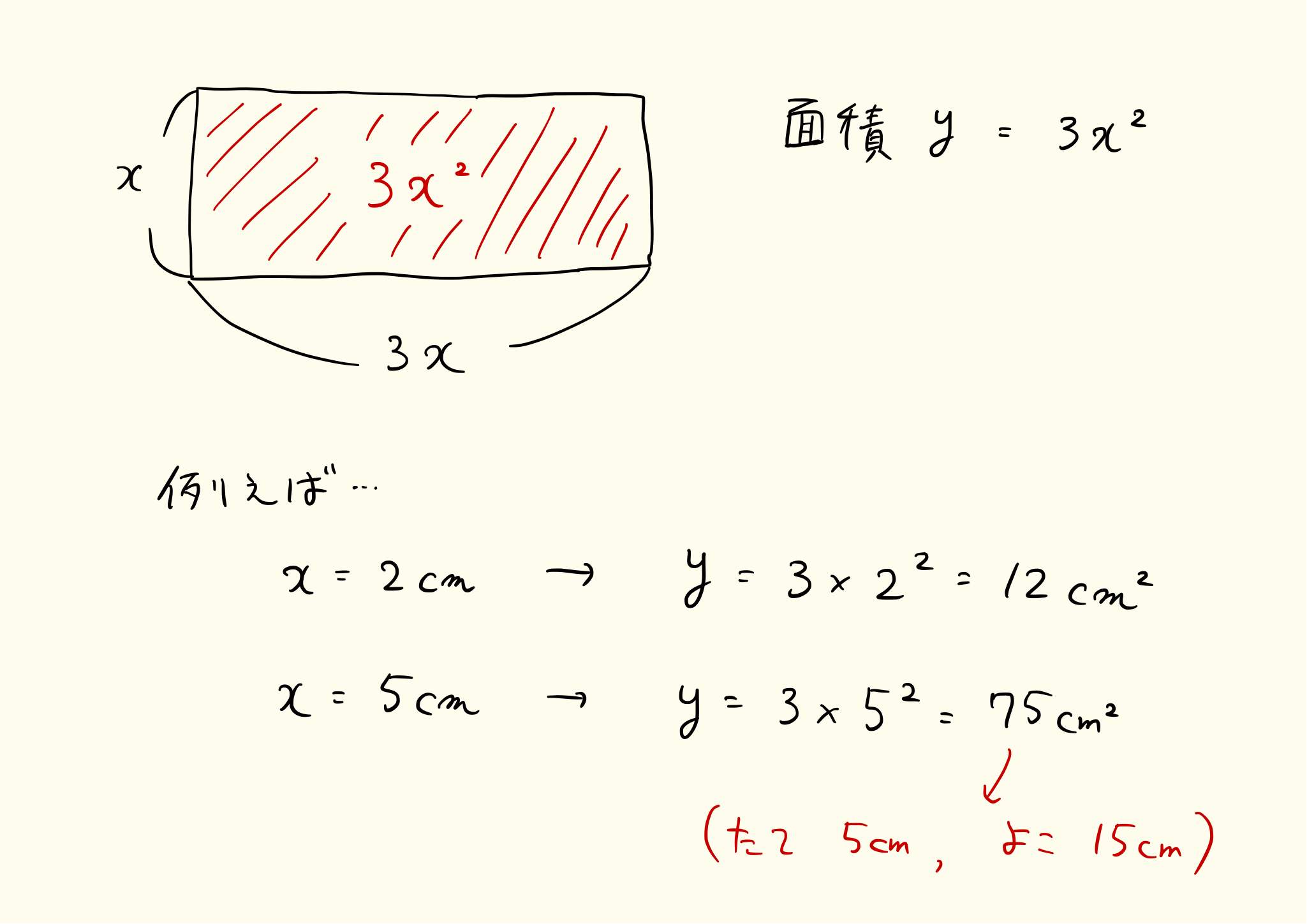 たての長さがx、よこの長さが3xの長方形の面積yを考えてみよう。