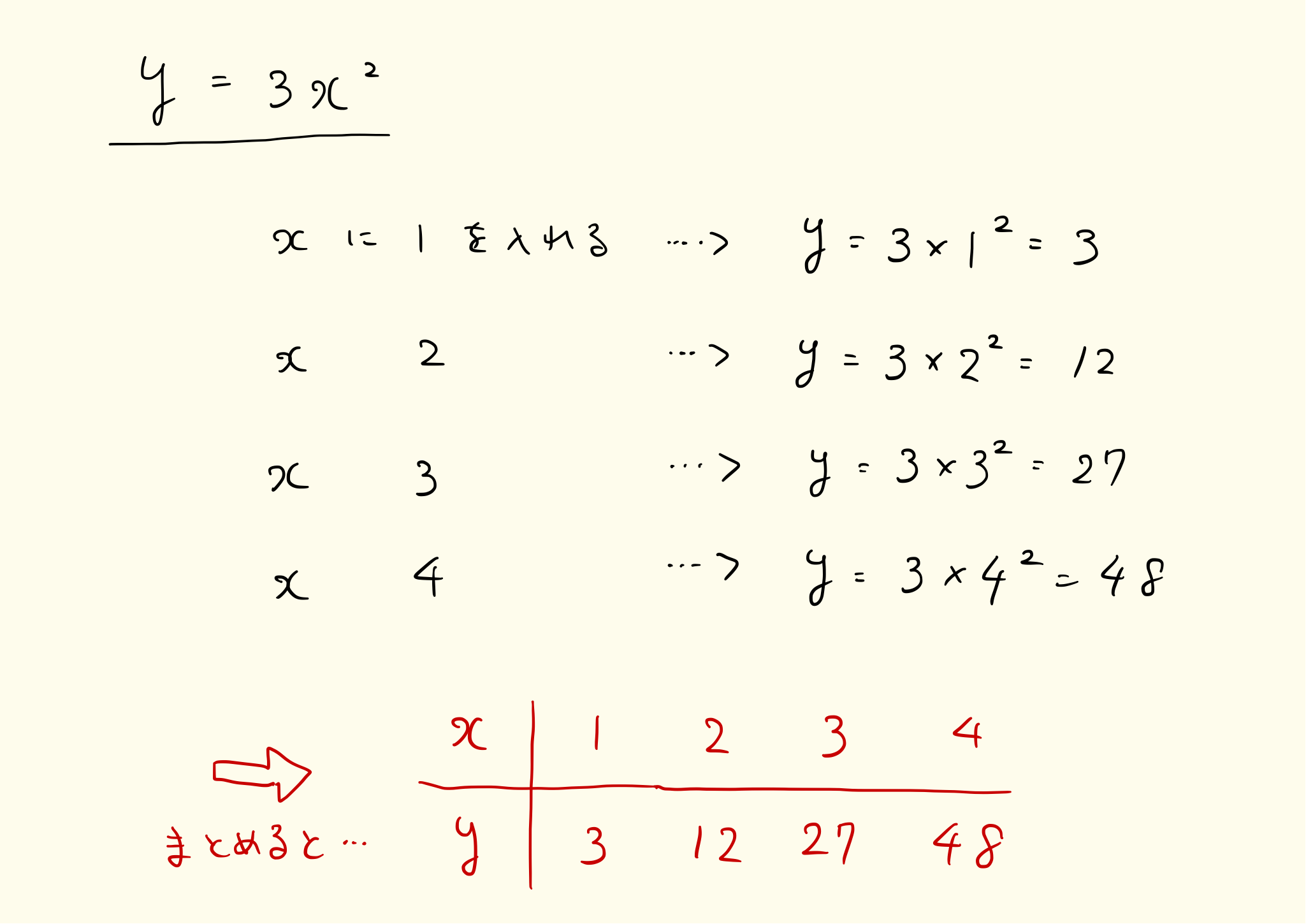 y=3x^2のようにx^2のある関数を2次関数といいます。y=3x^2のxにいろいろな値を入れて、yの変化を見てみましょう。