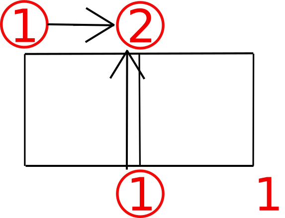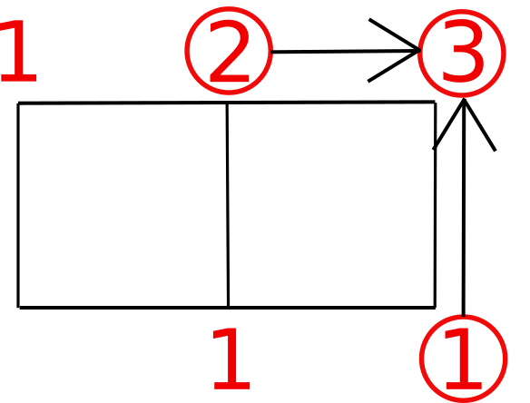 まずは上のように左と下の辺に沿って1という数字を各点にうちます。ここでは点が3個あるので3個うちました。赤い数字に注目。