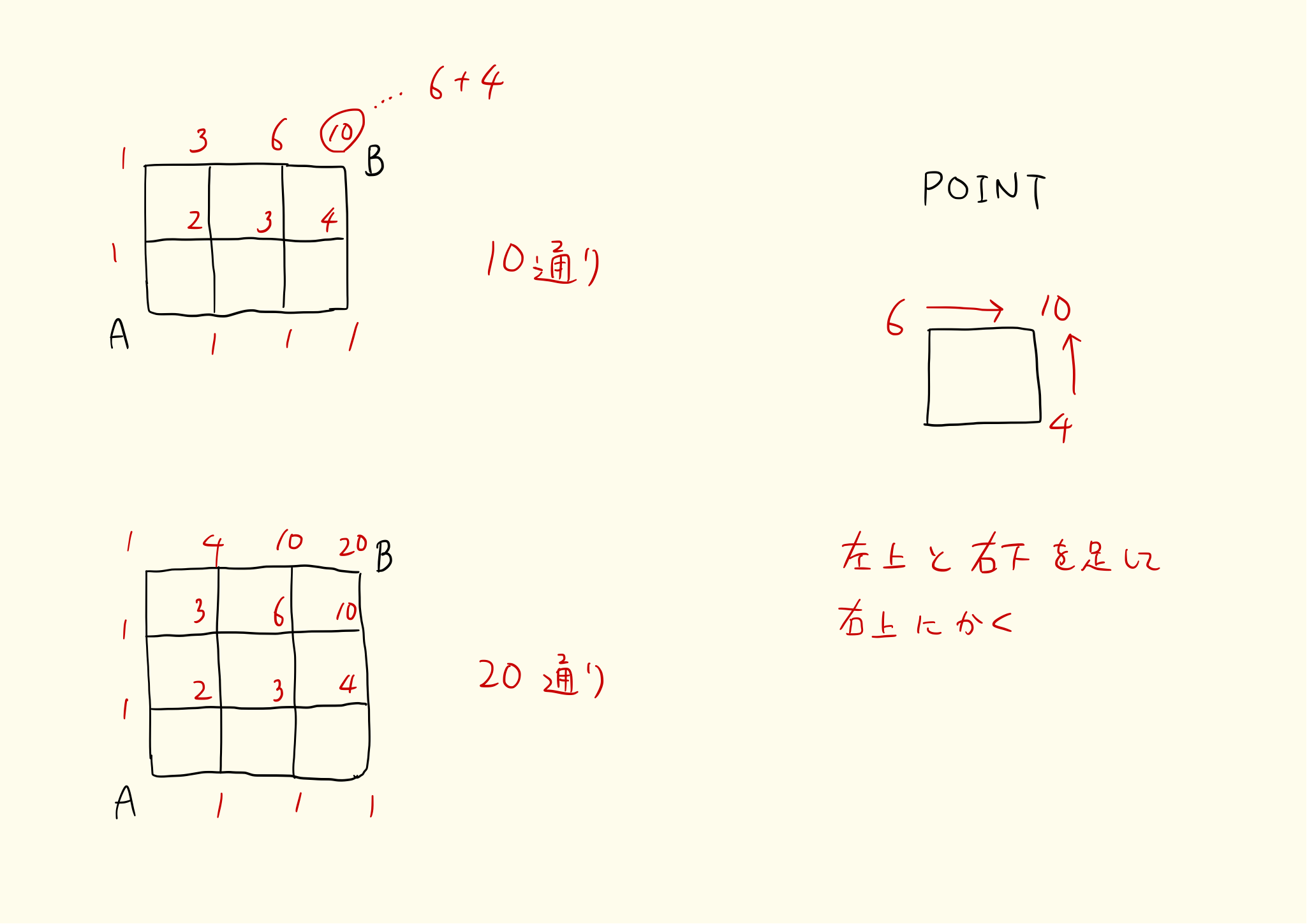 右上に向かって足していくイメージ。各点について、その点の左と下にある数字を足しています。ゴールにふられた数字は3です。よって経路の数は3通りとなります。
