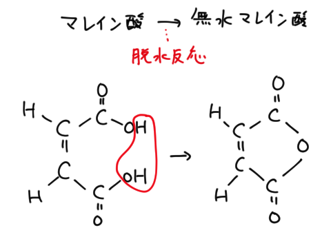 マレイン酸は分子内で脱水し、無水マレイン酸となる。
