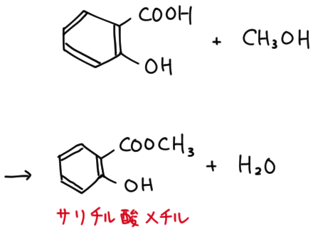 これはカルボン酸とアルコールの反応である。サリチル酸メチルは鎮痛剤、消炎剤として使われる。