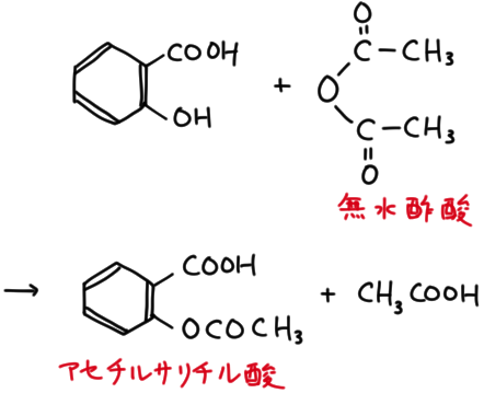 無水酢酸との反応をアセチル化という。サリチル酸と無水酢酸を反応させるとアセチルサリチル酸になる。