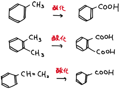上図のようにトルエンを酸化すると安息香酸になるが、一番下のスチレンもまた酸化されると安息香酸になる。