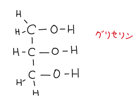 グリセリンは3つの炭素に3つのヒドロキシ基がついた分子。ヒドロキシ基とカルボキシ基は反応してエステルになるが、グリセリンと3つのカルボン酸が反応すると油脂になる。
