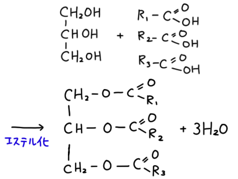 グリセリン+3カルボン酸=油脂+3水