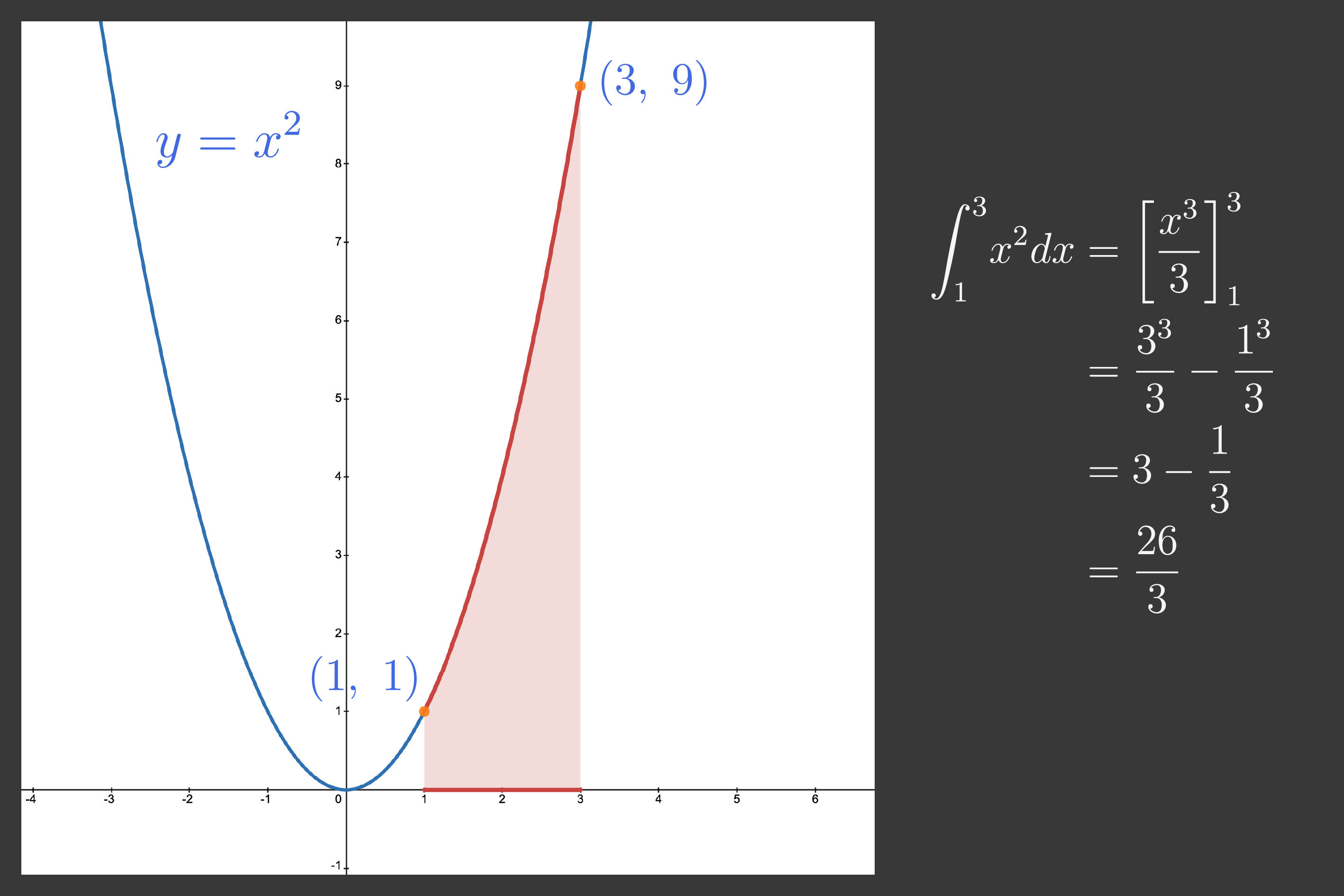 $y = x^2 \ (1 < x < 3)$ と $x$ 軸にはさまれた領域の面積は \[ S = \int_{1}^{3} ...