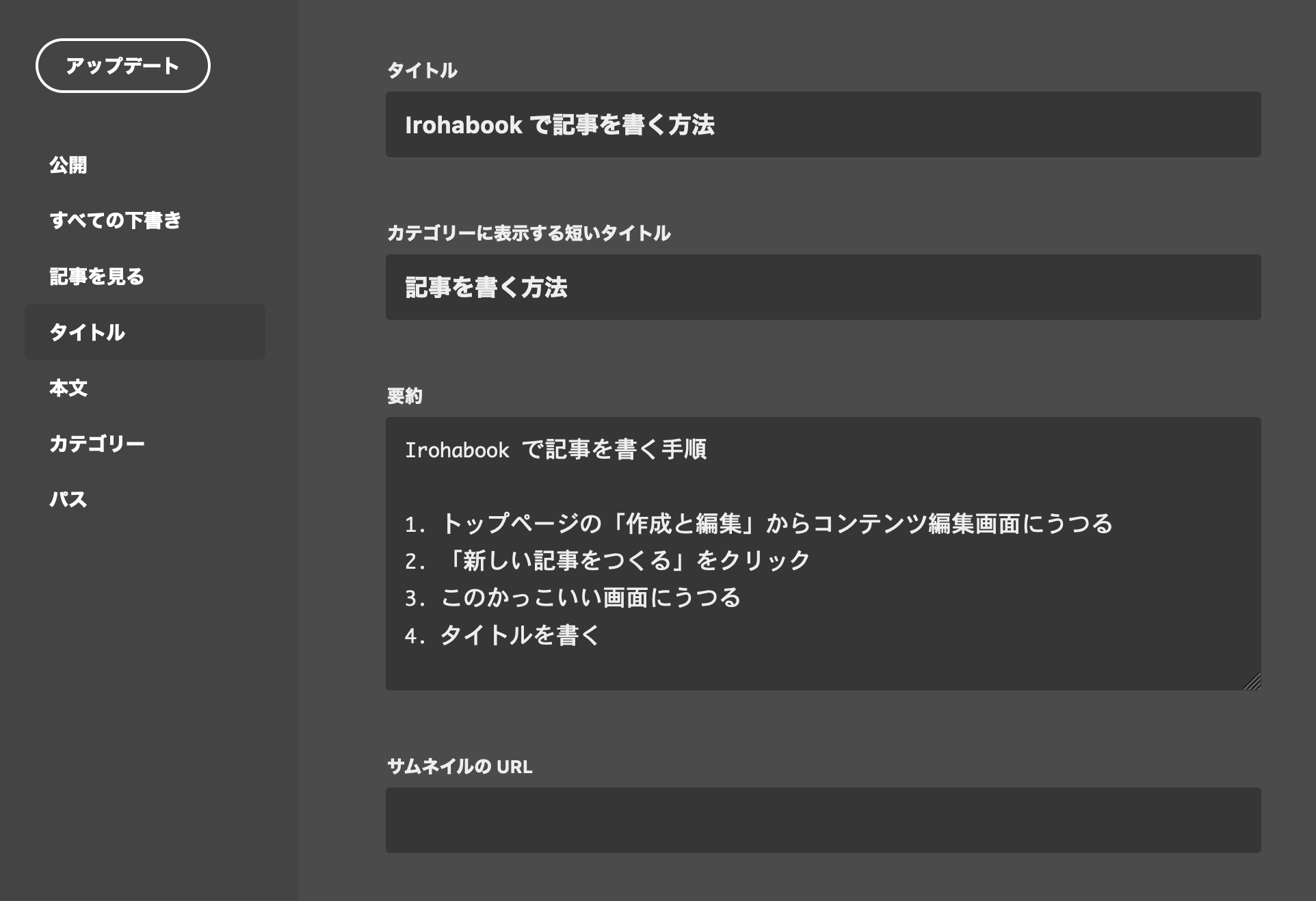 Irohabook の記事を書くためにはアカウントが必要です。ログイン後、トップページの**作成と編集**からコンテンツ編集画面...