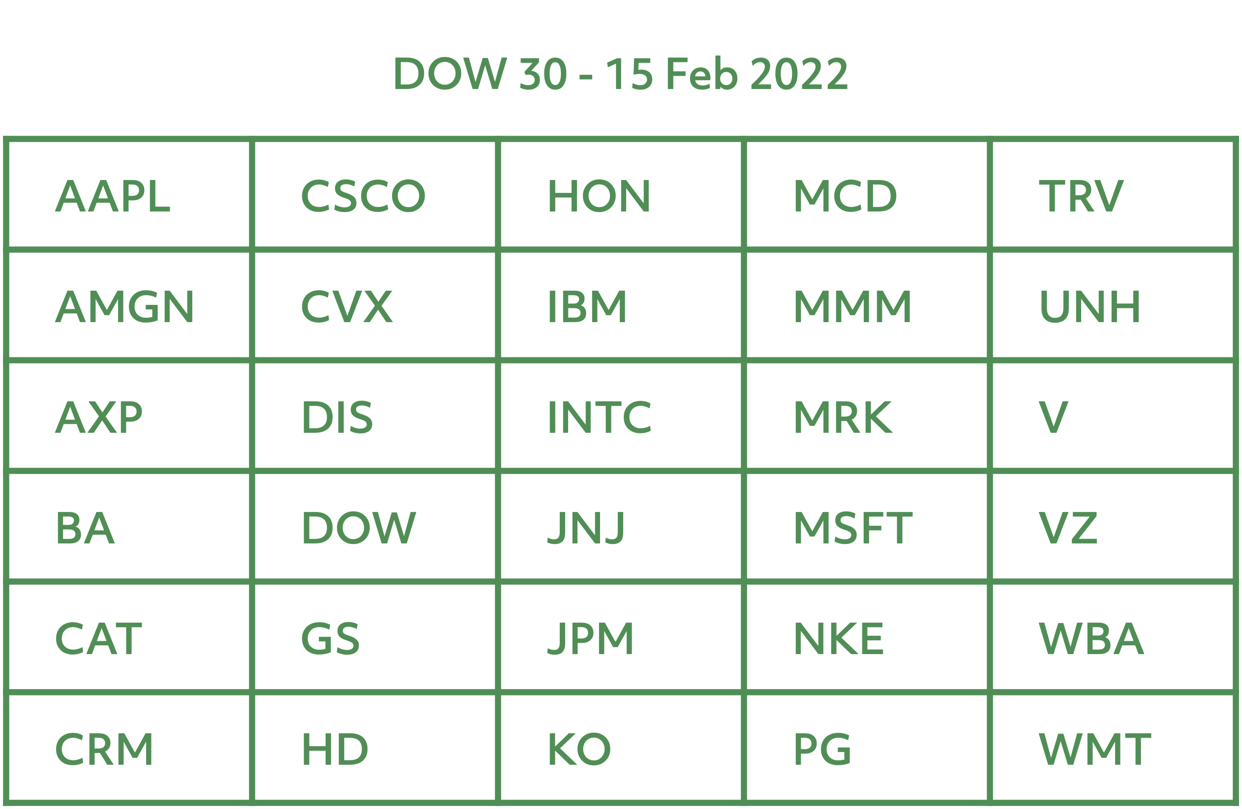 ダウ平均(ダウ工業株30種平均)の採用銘柄一覧(2022年)